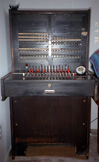 In June, 1998 I got a cord board! It was bought for me and delivered by a very dear friend. "Does it work?" you ask. Kind of. I have our phone lines connected to it, and you can plug into them and hear a very faint dial tone or disconnect using the levers, but you cannot dial and there is no talking circuit. Besides external power, this board was made to be used in conjunction with a (albeit very antiquated) PBX switching system.
