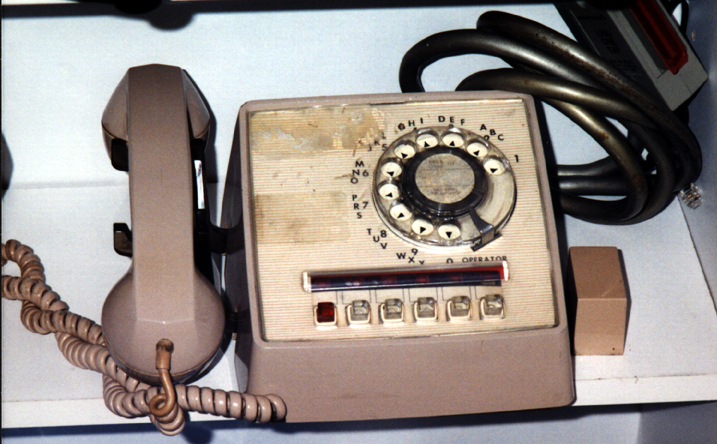 The model 186 is Automatic Electric's multi-line business phone to match the Western Electric 555, but look how much bigger it is! The only possible reason for that would be that Automatic Electric used bigger, clunkier parts than Western Electric. An interesting feature of these phones is the light strip above the line buttons. Instead of lighting the buttons themselves, as Western Electric did, these phones had LEDs on the strip above the buttons that would come on or flash, indicating the status of each line. This unit has a sticker on the bottom from 1982, and it appears to be wall-mountable (!). The little box attached to the right side of the phone has a key lock on the back and so was probably used to restrict calling out. It was discarded by a business in Huntington Beach, California.