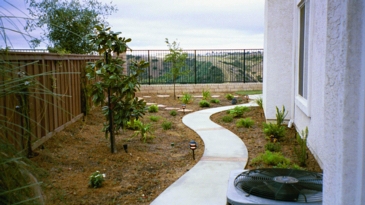 This is what you would see after entering the gate to the side yard. Visible in the after shot are the walkway, the magnolia tree, groundcover, some ferns, and at the front right, the air conditioning compressor (there was no better object with which to represent it).