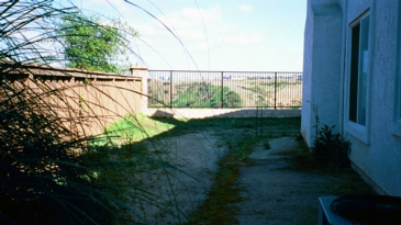 This is what you would see after entering the gate to the side yard. Visible in the after shot are the walkway, the magnolia tree, groundcover, some ferns, and at the front right, the air conditioning compressor (there was no better object with which to represent it).