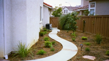 Looking from the rear yard towards the side entry gate, in the before picture you can see a brown bush in the far corner. That's pampas grass. There are two types: brown and green. Ours is green. The software only offers this plant in brown.